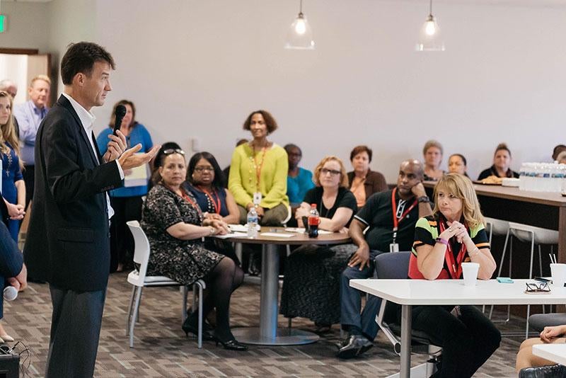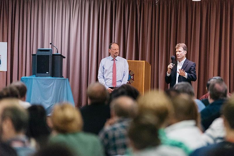 KBR CEO Stuart Bradie (left) and KBRwyle President Roger Wiederkehr speak to heritage HTSI employees at a town hall in Lanham, Maryland.