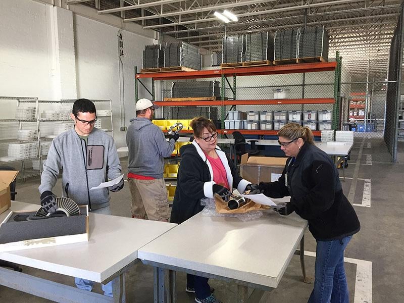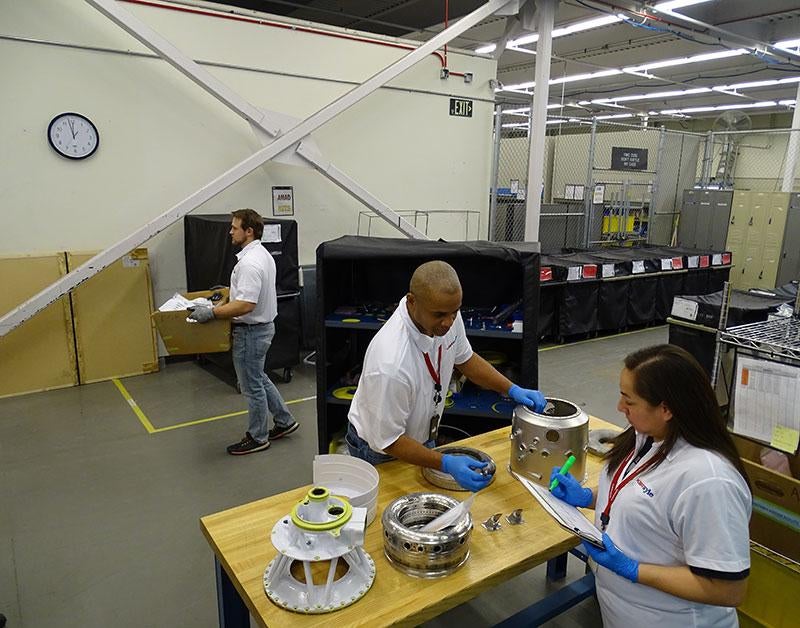 KBRwyle's Secondary Power Logistics Solution team is kitting an F-15E Strike Eagle jet fuel starter at Hill Air Force Base. Left to right, Jason Arrant, Tyrone Washington and Victoria Dominquez ensure that the correct parts are installed in the kit, providing depot mechanics all of the materials needed to assemble the JFS. Once assembled and tested, the newly repaired JFS will be stored at a KBRwyle warehouse ready to be issued to the field on demand.